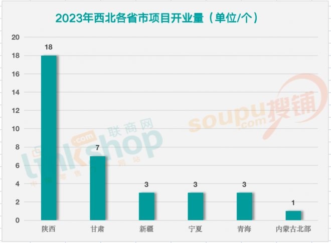 從開業數量上看,2023年擬開業項目最多的是陜西,擬開業商業項目為18家,占整個西北區預計新開項目總量一半;甘肅位居第二位,擬開7個購物中心;新疆、寧夏、青海均預計新開3個商業項目,而內蒙古北部擬開1個新項目。
