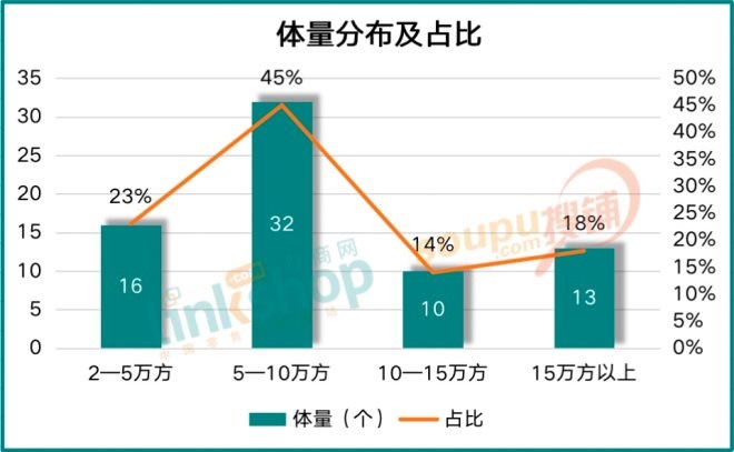 從明年計劃開業的商業項目體量來看,體量分布與以往相似,5—10萬方(含5萬方,不含10萬方)是最受歡迎體量,數量最多為32個,占比約45%;2—5萬方(含2萬方,不含5萬方)擬開業項目為16個,占比約23%;15萬方以上(含15萬方)項目數量為13個,占比約18%;10—15萬方(含10萬方,不含15萬方)擬開業項目數量為10個,占比約10%。
