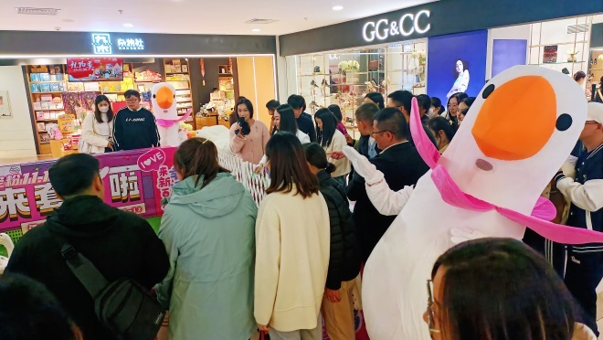 以“來新百當幸運鵝”為主題進行全館包裝,以萌萌大鵝為宣傳點,重設計、輕成本,統一視覺設計,設置美陳打卡點及創意地貼;提升體驗性、趣味性、互動性,配合特色的套鵝游戲互動,點燃現場人氣!以重點品類帶動全局,品類優化組合,豐富晚間活動,打造年輕潮流新地標及夜經濟消費亮點;會員活動上,針對新老會員開展不同力度的促銷活動,強化年輕會員的觸達;開展抖音直播活動,吸客引流,帶動線上、線下人氣飆升。同時準備了5500份大鵝玩偶用作創意贈禮,全方位為顧客打造誠意十足且富有創意的 “新百雙11”,讓顧客盡情嗨購,共同感受城市商業的時尚脈動。