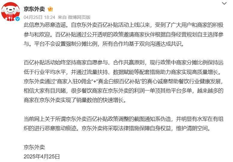 值得一提的是,近日有媒體報道稱京東外賣再次調整“百億補貼”政策,要求所有補貼活動均需要商家分攤50%成本。對此,京東外賣緊急辟謠,稱“從未強制分攤”。