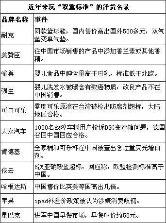 事實(shí)上,從生活日用品、電子產(chǎn)品、食品領(lǐng)域到汽車領(lǐng)域,都存在著國(guó)內(nèi)外的雙重標(biāo)準(zhǔn)。例如,自2009年以來,強(qiáng)生產(chǎn)品在各國(guó)被召回25次,但這些召回基本不涉及中國(guó)。一些知名筆記本廠商在全球召回問題筆記本的同時(shí),卻對(duì)我國(guó)的消費(fèi)者推出所謂的“自愿更換”計(jì)劃。此外,蘋果公司iPad1退差價(jià)執(zhí)行雙重標(biāo)準(zhǔn),豐田公司對(duì)中美市場(chǎng)上問題汽車的賠償實(shí)施雙重標(biāo)準(zhǔn),沃爾瑪、麥當(dāng)勞、雀巢等在國(guó)內(nèi)外實(shí)施雙重產(chǎn)品標(biāo)準(zhǔn),都曾引發(fā)消費(fèi)者質(zhì)疑。